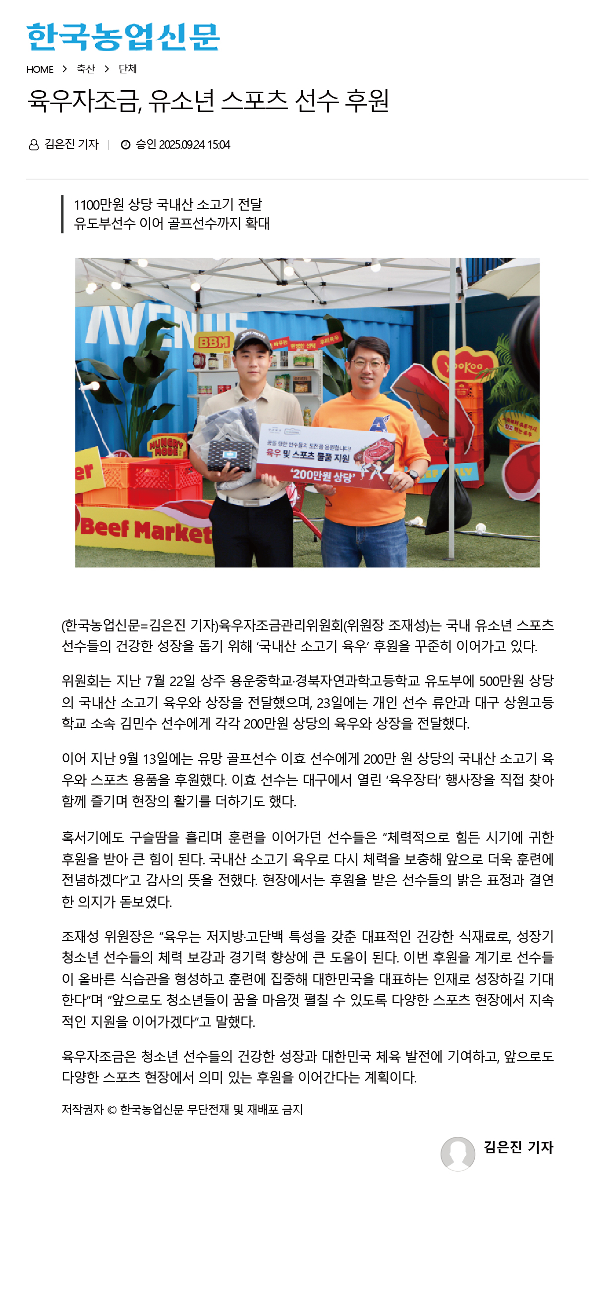 [언론보도] 육우자조금, 1100만 원 상당 국내산 소고기 후원