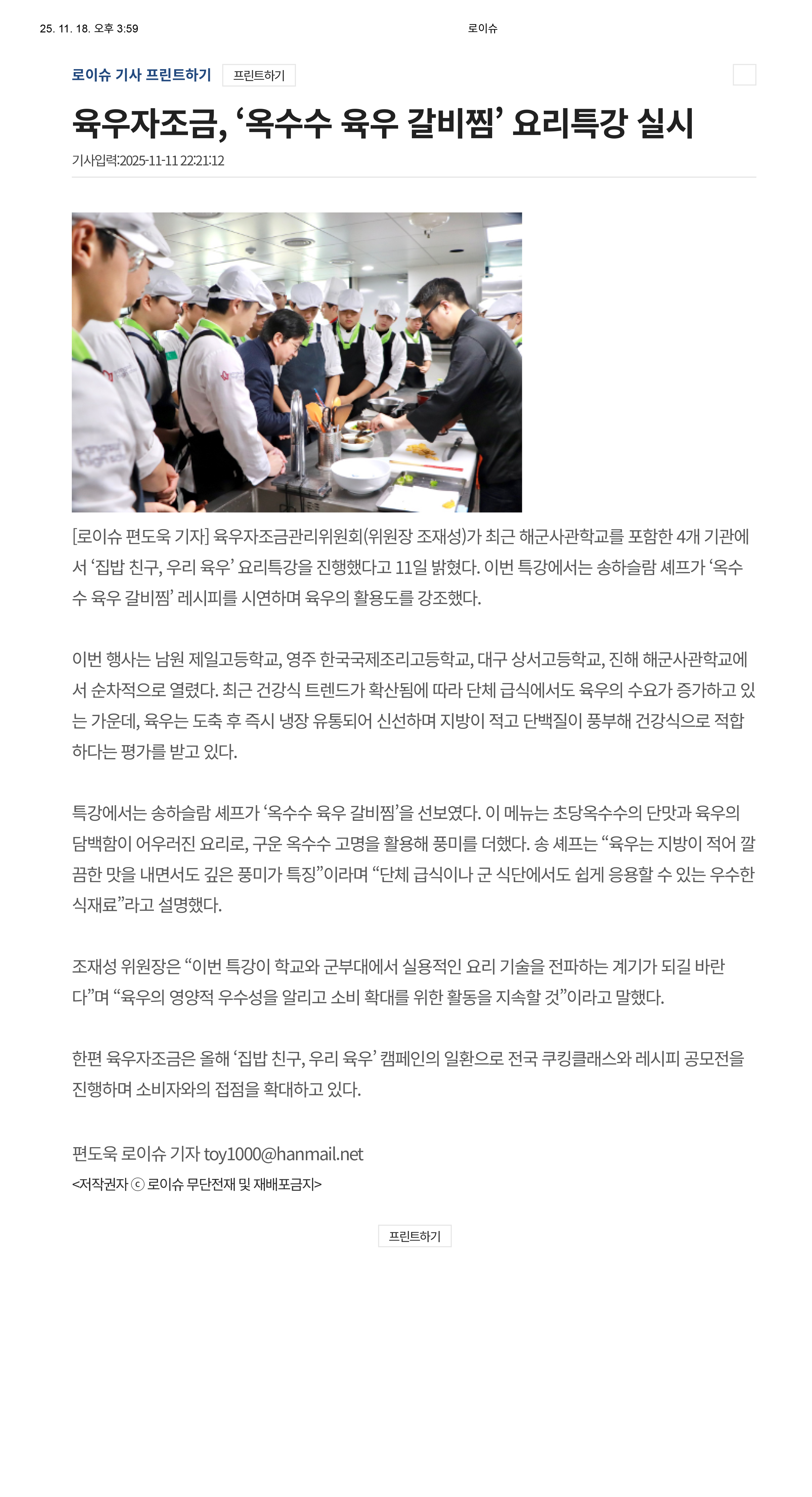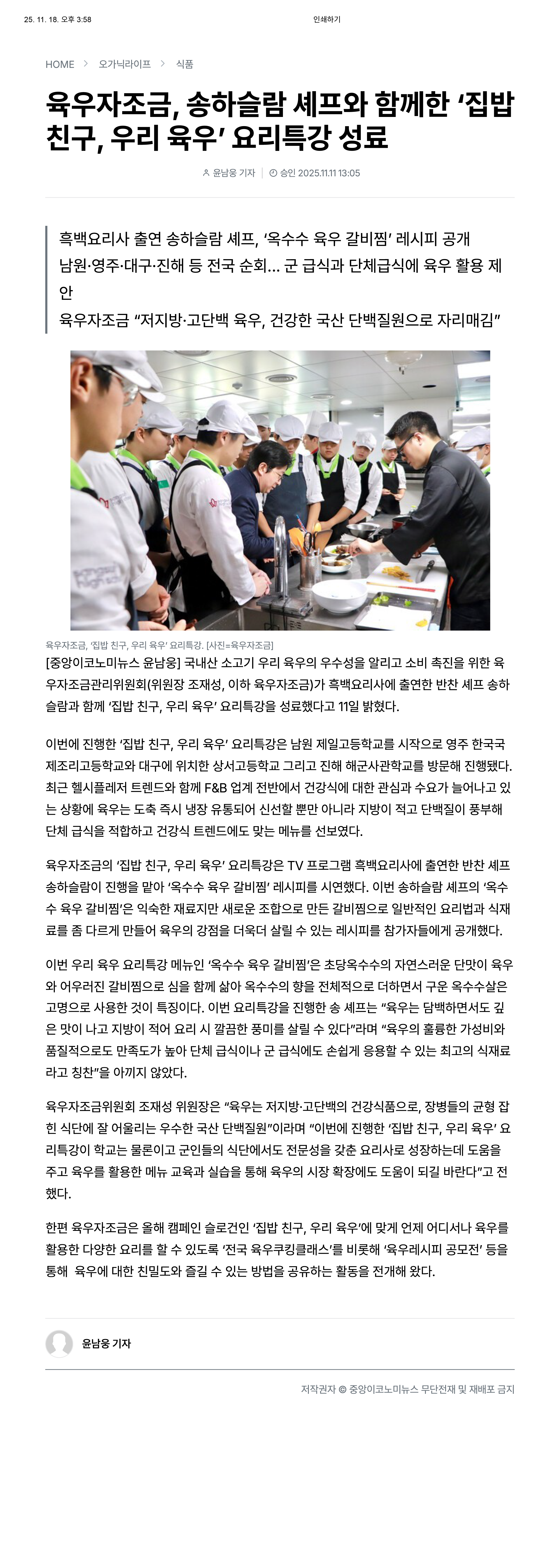 [언론보도] 육우자조금, ‘옥수수 육우 갈비찜’ 요리특강 실시