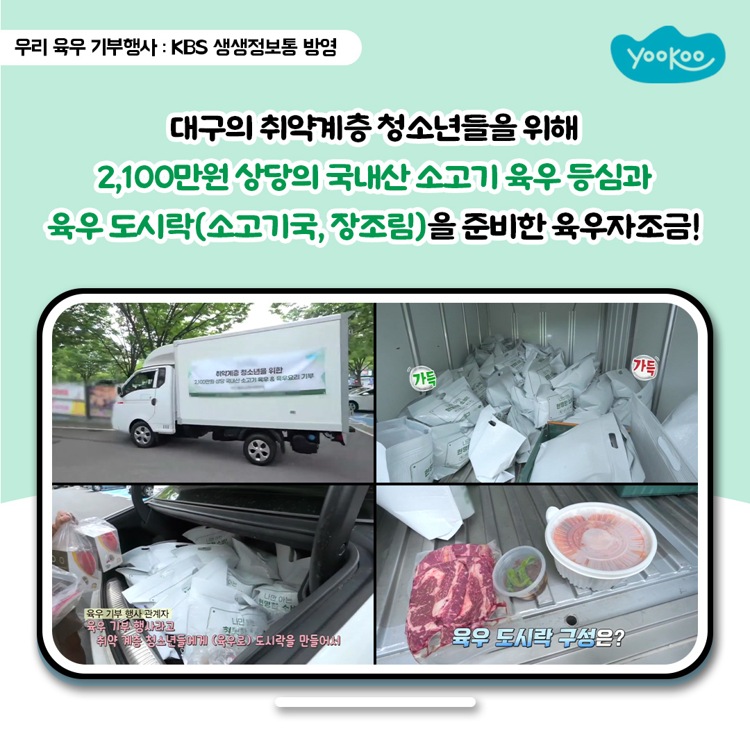 #육우기부행사 #kbs생생정보통 #방영마음까지 따뜻해지는 우리육우 기부행사🐄맛있는 육우를 전하는 특별한 현장이KBS 생생정보통에 방영 됐어요🐮🍀대구의 취약계층 청소년들을 위해2,100만원 상당의 #국내산소고기육우 등심과#육우도시락 을 준비 했답니다!맛있는 행복을 나누기 위해 동참해주신#요리연구가윤지아 님의 레시피도 대공개💕육우 소고기 등심과 육우 요리를 신선하게 전달하기위해조재성 관리위원장님을 비롯한 여러 봉사자분들이직접 배달하며 따뜻한 마음을 나누는생생한 현장을 소개합니다~🍀육우자조금의 선한 영향력을 응원 해주세육🐮💕