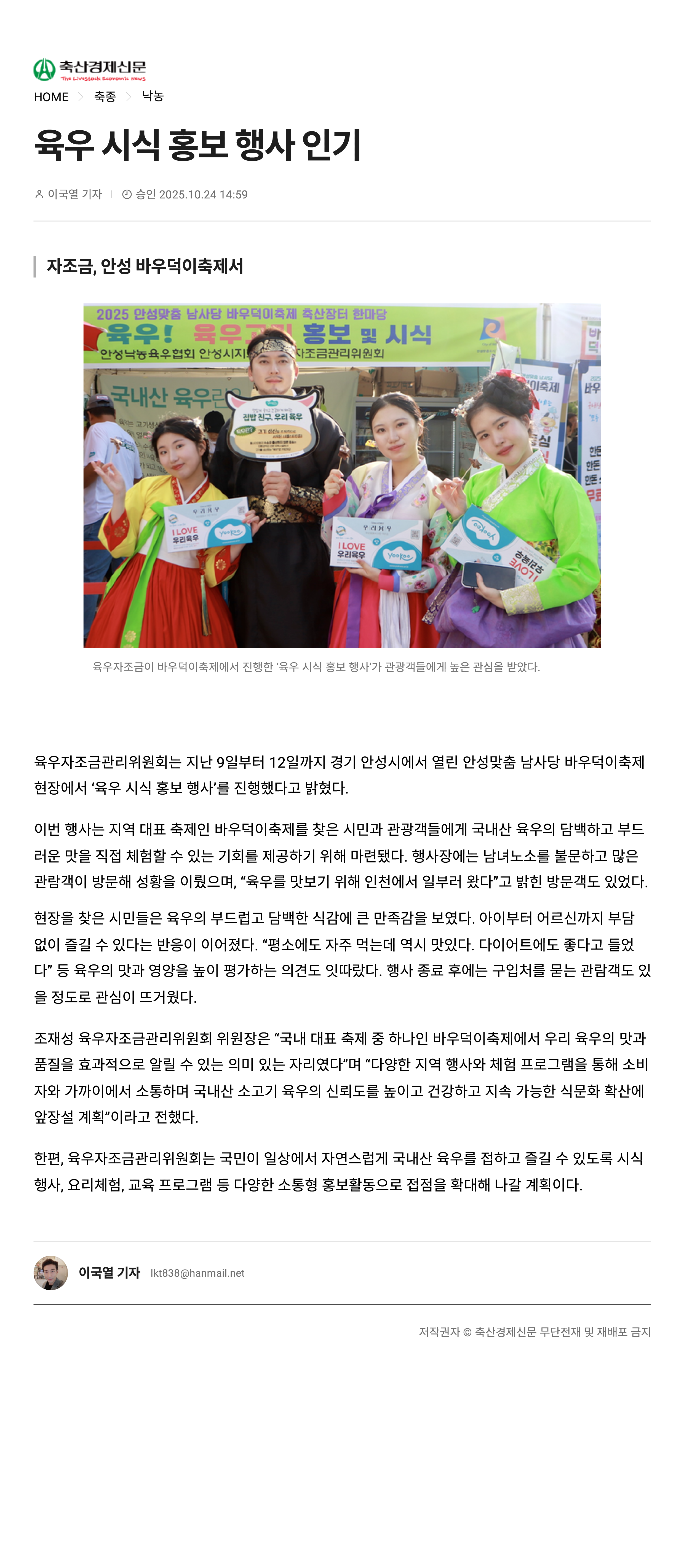 [언론보도] 육우자조금, '안성맞춤 남사당 바우덕이축제'서 육우 시식 행사 진행