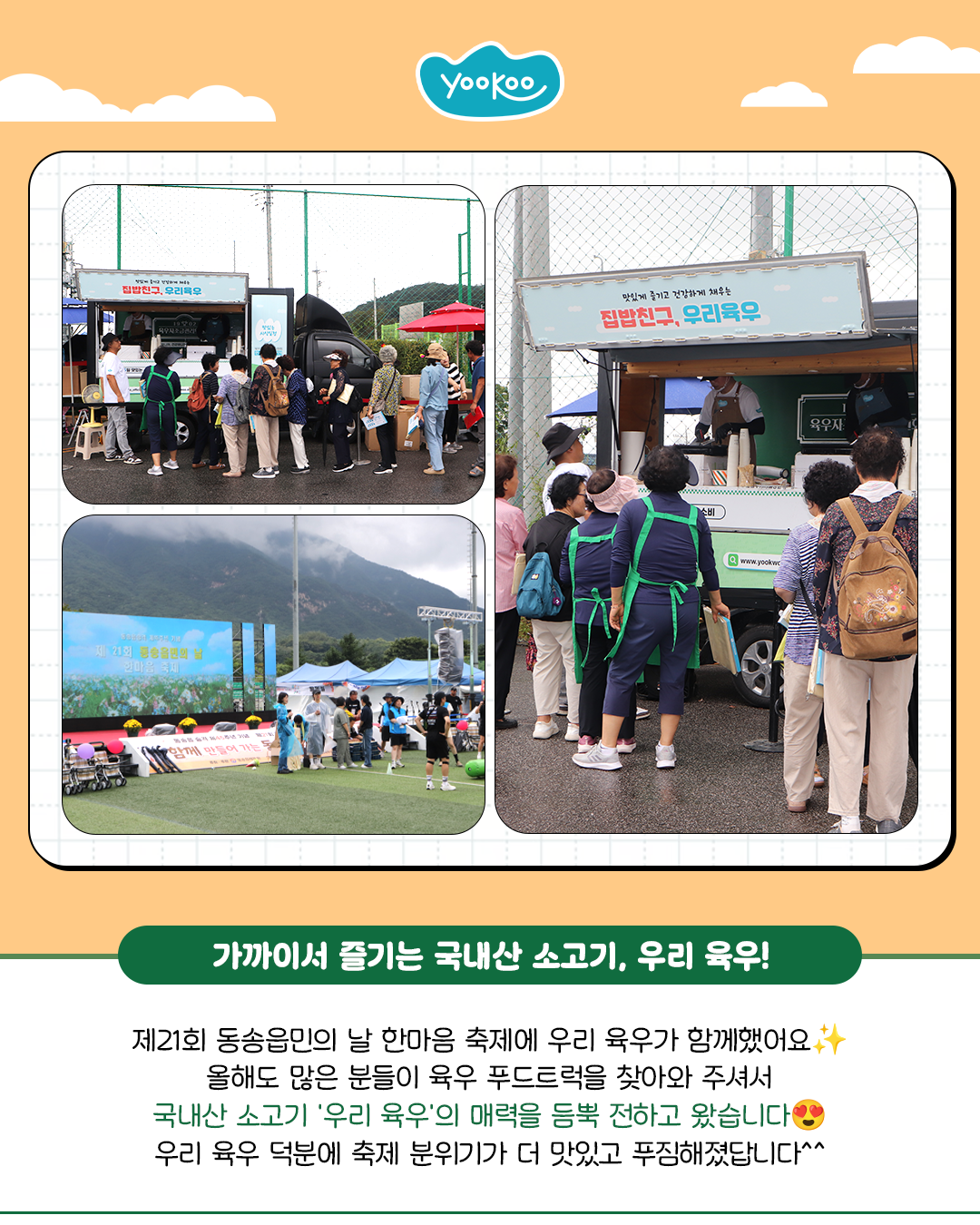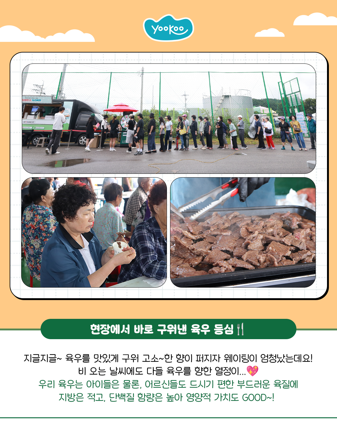 축제 분위기와 찰떡인 집밥 친구, 우리 육우!🐮♥️철원 동송읍민의 날 한마음축제 현장을 소개합니다🤩남녀노소 불문 어르신들까지 모두가 줄을 서서맛있게 즐긴 국내산 소고기 우리 육우🥩부드럽고 담백한 맛에 모두가 감탄✨저지방 고단백, 합리적인 가격까지 갖춘든든한 단백질 식재료, 우리 육우!앞으로도 많은 관심과 사랑 부탁드려육💝